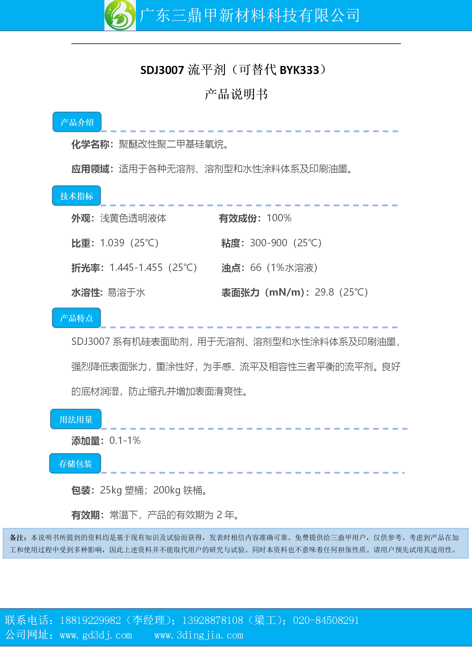 SDJ3007系有机硅表面助剂,用于无溶剂、溶剂型和水性涂料体系及印刷油墨,强烈降低表面张力,重涂性好,为手感、流平及相容性三者平衡的流平剂。良好的底材润湿,防止缩孔并增加表面滑爽性。