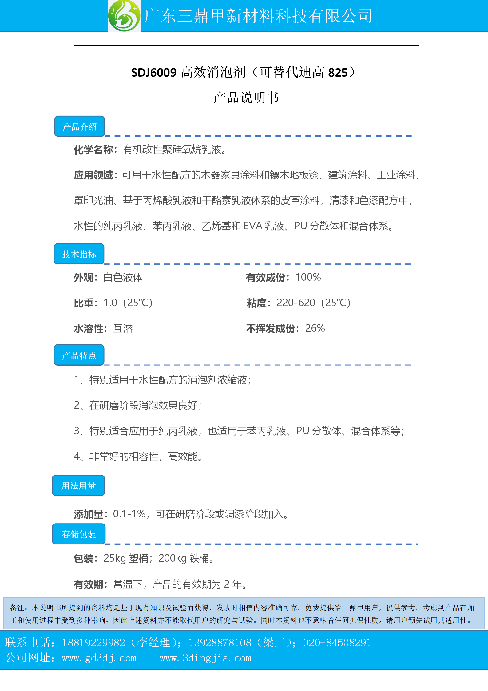 应用领域:可用于水性配方的木器家具涂料和镶木地板漆、建筑涂料、工业涂料、罩印光油、基于丙烯酸乳液和干酪素乳液体系的皮革涂料,清漆和色漆配方中,水性的纯丙乳液、苯丙乳液、乙烯基和EVA乳液、PU分散体和混合体系。
